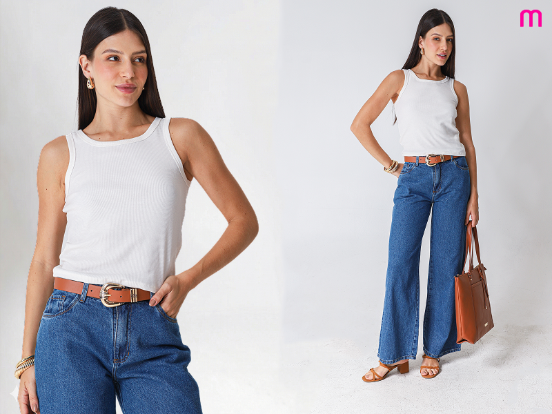 A calça jeans wide leg é o grande destaque entre as fashionistas. Com caimento soltinho, cintura alta e pernas amplas, ela alonga a silhueta e oferece liberdade nos movimentos. Perfeita para quem busca conforto aliado ao visual moderno, a wide leg combina facilmente com camisas, jaquetas e coletes jeans, formando um look all jeans atual e sofisticado.